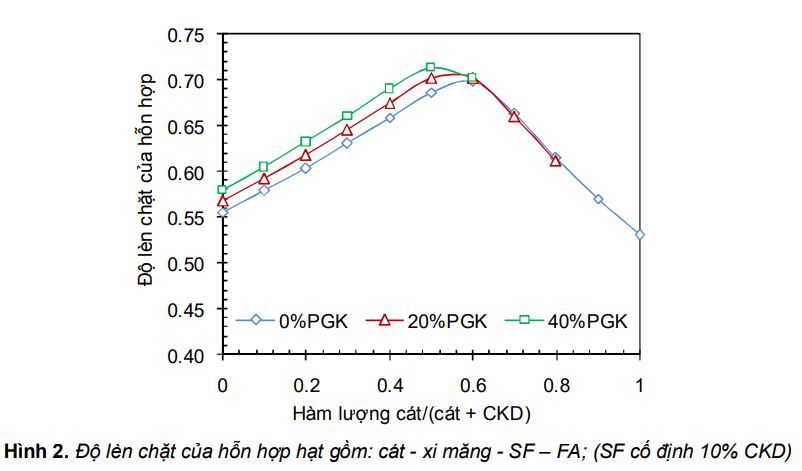 Như vậy, thành phần hạt ở đây được xem xét như là hệ hai cấu tử gồm cát và CKD. Quan hệ giữa độ lèn chặt của hỗn hợp với tỷ lệ của vật liệu thành phần được thể hiện ở hình 2. Như vậy, dựa trên kết quả tính toán thì lượng tối ưu được xác định với tỷ lệ cát/(cát + CKD) là 0.50. Tỷ lệ phối hợp giữa 3 cấu tử lúc đó sẽ là 50% cát + 30% xi măng + 20% PGK.