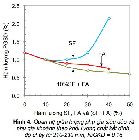 Tuy vậy, khi tăng hàm lượng dùng SF, do tỷ diện của SF rất lớn, khoảng 18.000-20.000 cm2/g [16, 17] nên cần một lượng nước rất lớn để thấm ướt bề mặt và hiệu ứng này không thể bù đắp lại được các hiệu ứng có lợi của SF. Điều này thấy rõ khi hàm lượng SF tăng lên 30% và 40% thì lượng phụ gia siêu dẻo tăng lên đáng kể [17].