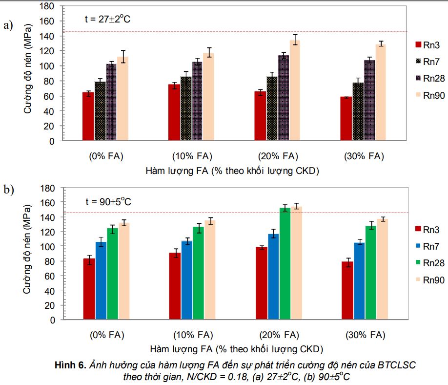 Như vậy, cường độ nén BTCLSC sử dụng 20% FA đạt giá trị lớn nhất đối với cả hai chế độ dưỡng hộ tiêu chuẩn và dưỡng hộ nhiệt ẩm cao, tương ứng là 114 MPa và 153 MPa.