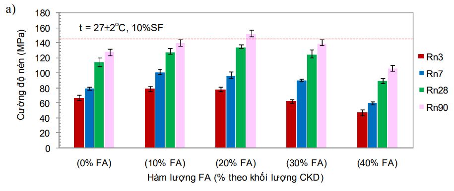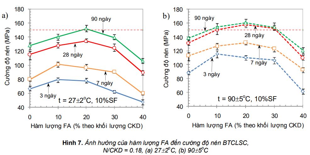 Cường độ nén BTCLSC sử dụng 20% FA đạt giá trị lớn nhất ở cả chế độ dưỡng hộ tiêu chuẩn và dưỡng hộ nhiệt ẩm, tương ứng là 114 MPa và 153 MPa. Tiếp tục tăng hàm lượng FA thì cường độ nén của bê tông bắt đầu giảm.