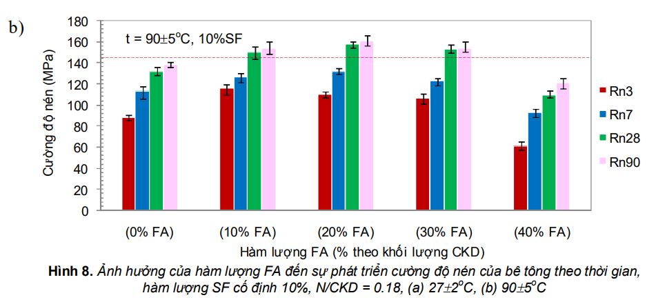 Với các mẫu được dưỡng hộ trong điều kiện nhiệt ẩm (t = 90o±5oC), tốc độ phát triển cường độ ở những ngày đầu tăng nhưng tốc độ phát triển cường độ ở tuổi dài ngày tăng không nhiều, chẳng hạn cường độ nén ở tuổi 90 ngày tăng không nhiều so với tuổi 28 ngày. Khi hàm lượng FA sử dụng tăng lên thì cường độ nén của bê tông giảm tương ứng với các điều kiện dưỡng hộ.